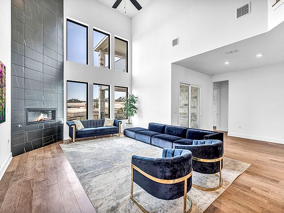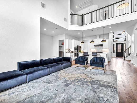 A statement chandelier sets the tone upon entry, complemented by white oak floors, designer lighting, and a gas fireplace with floor-to-ceiling tile that add both warmth and sophistication. The chef-inspired kitchen is a true showpiece, featuring quartz countertops, stainless steel appliances, a walk-in pantry, and an oversized island perfect for casual dining or entertaining. The adjoining dining area blends elegance with comfort, ideal for both intimate meals and larger gatherings.