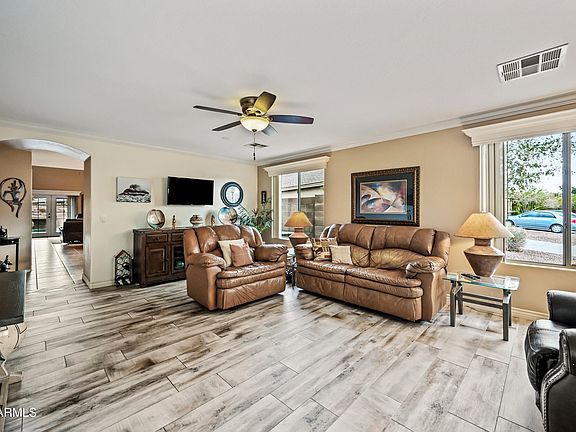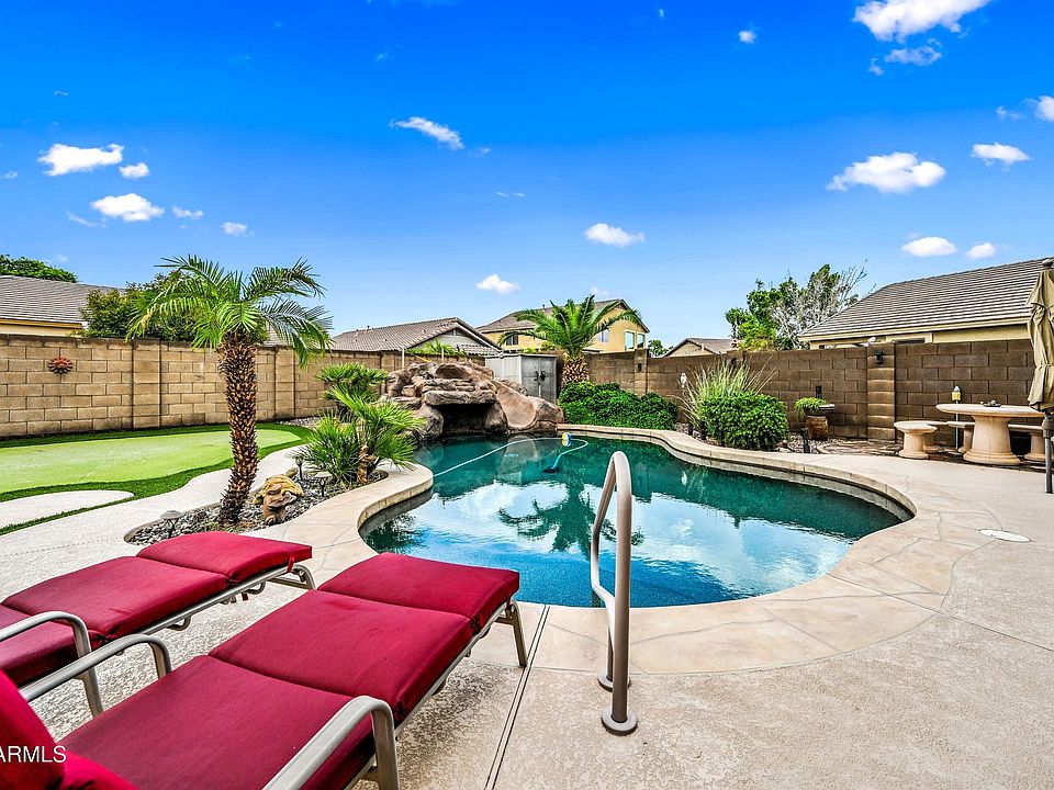Located in the highly desirable city of Goodyear, this 4 bedroom, 2.5 bath home combines style, space, and convenience. Soaring ceilings and an open floorplan create an inviting setting for everyday living and entertaining. The primary suite is on the main floor, while upstairs features three bedrooms plus a large loft—perfect for a home office, game room, or additional living area. Step outside to your private backyard retreat with a sparkling pool, a putting green, and plenty of room to relax or host gatherings. Enjoy peace of mind with a newer AC (2022) and cost-saving solar panels. Close to top-rated schools, parks, shopping, dining, and easy freeway access—this home truly has it all.