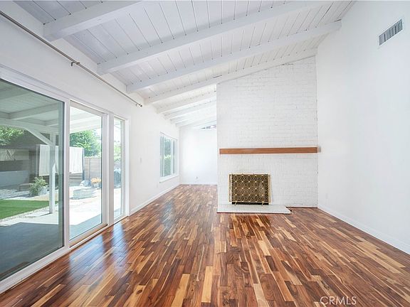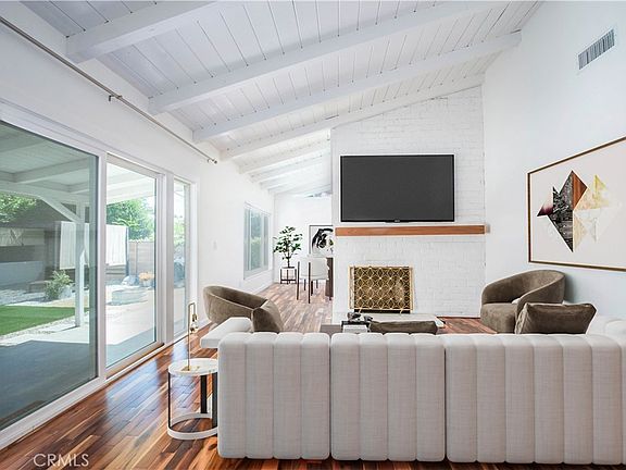 Step into timeless design and effortless living in this beautifully upgraded 4-bedroom, 2-bath mid-century gem, ideally situated on a tree-lined street in the highly sought-after Rolling Greens neighborhood of Granada Hills. Spanning 1,795 sq ft, this single-story residence seamlessly blends iconic mid-century architecture with clean, modern Scandinavian style—offering crisp lines, refined functionality, and sun-drenched, open living spaces. At the heart of the home lies a striking Scandinavian-inspired kitchen designed with minimalist flair. It features sleek custom cabinetry, natural wood accents, terrazzo flooring, and high-end Fisher & Paykel appliances including a luxury cooktop and oven. Hidden panel-front refrigerator and dishwasher complete the look, preserving the kitchen’s seamless and sophisticated aesthetic. The open-concept design flows effortlessly into the dining area and expansive living room, where vaulted beam ceilings and generous windows enhance the light and airy ambiance—ideal for both relaxed living and stylish entertaining. The thoughtfully designed floor plan includes a private hallway leading to the oversized primary suite—an inviting retreat with ample windows and French doors that open directly to the serene backyard. The spa-like primary bath offers a calming escape, complete with a soaking tub perfectly positioned beneath a skylight, a separate walk-in shower, and luxurious finishes throughout. Three additional bedrooms provide comfortable versatility, each filled with natural light. One of the secondary bedrooms features its own French doors opening to a peaceful side patio—perfect for a guest room, home office, or creative studio. Both bathrooms have been tastefully remodeled to reflect the home’s sleek, modern aesthetic. Step outside and enjoy multiple spaces for outdoor entertaining, from the covered patios to a dedicated play area, artificial turf, and beautifully landscaped drought-tolerant gardens that create a private, low-maintenance oasis. No detail has been overlooked in this masterfully curated home—featuring rich Acacia wood flooring, recessed lighting, newer roof, upgraded electrical panel, updated HVAC, Owned solar panels, EV charger and more. This is a rare opportunity to own a truly special Mid-Century Modern home in one of Granada Hills’ most coveted enclaves.