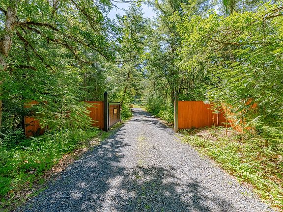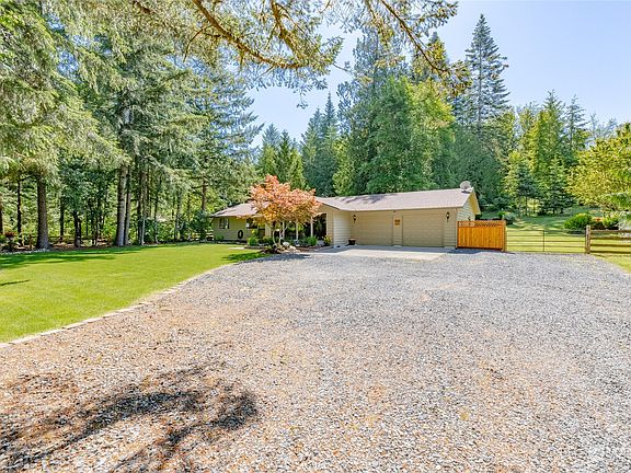 Enjoy and explore this heavenly slice of earth - An accommodating and gated 3 bedroom, 2 bathroom rambler on a dreamy 5+ acre lot with 24 x 32 shop w/ power & water, potting shed, established garden beds, fire pit and trails to blaze around your own property! Light and bright covered entry way with sunken living room. Open kitchen with breakfast bar and stone countertops and SS appliances. Additional dining room and family room with wood stove and slider to back yard. Sink with windows overlooking property. Separate laundry and storage room. Primary suite with private attached bathroom. Hall bathroom and two additional bedrooms. Attached oversized two car garage with generator hookup. Individual well and septic.
