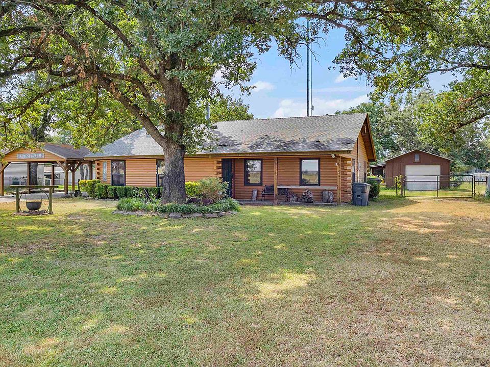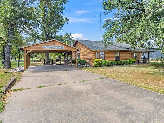 Tucked conveniently off any major road you will find this log cabin home! Offering 3 bdrms 2 full baths.Cabin sweet cabin!Wood burning stove for the winters,vaulted ceiling in Lv Rm. knotty pine walls thru out the home. Brkfst bar in kitchen with dining room area.Front and back porches.Oversized 16X39 garage for the boat storage or great workshop space with concrete flooring.Carport parking.The 1.5 acres has been designed to contain friendly animal pets.Bring yours!Plant shed for the gardener,so much extra storage room.Property is serviced by well water.Close to Lake Fork for the get away fishing trip!Pecan trees for the baker in your family!Nice mature shade trees and mature landscaping.Quiet county road.You just have to come and see this one!!Will not disappoint!!Secondary bdrm has blt in Murphy bed and could be office.16X39 garage lots of room for the boat!