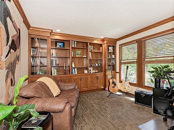 Lorien Woods ~ stunning setting ~ beautifully maintained 2 story home with a warm & sophisticated interior. Enter into a double-height foyer filled with natural light, leading to a comfortable, functional floorplan. Handsome Library with built-in shelving. Truly magnificent Great Room features a full wall of glass overlooking your private oasis of a backyard. Chef’s Kitchen with all stainless steel appliances is cooks’ dream ~ includes island/snack bar, pantry, soffitless wood cabinets, plus more-than-enough countertop workspace. Oversized eating area leads to the gorgeous backyard with grilling patio, firepit, koi pond and petite waterfall. Screened Gazebo will be a favorite hangout place. The Living Room has wood floors, and is currently used as a Billiard Room. Laundry, and half Bath on first. Upstairs are 4 bedrooms and 2 fabulously renovated Baths. Hall bath has twin vanities. Master Bedroom is huge with an adjoining Master Bath that is no less than fabulous! Natural stone walk-in shower, separate freestanding soaking tub, and skylit dual vanities. You will truly feel you have wandered into a most exclusive Spa. Full Basement includes play area and media rooms plus a full shower bath. Unfinished basement area offers space for your future workshop. Additional updates and special features include: several new Pella windows installed in 2024, new LVT flooring installed in 2022, newly paved driveway installed 2022. Electric car charger set up in garage. Patio installed with “anti-mosquito” low-voltage protection. petite pond & waterfall. With its ideal “country-location”, enjoy the desirable community of Lorien Woods and the community pool ! Easy access to freeway, shopping and award-winning Kenston schools. This is a legacy home designed to create memories !