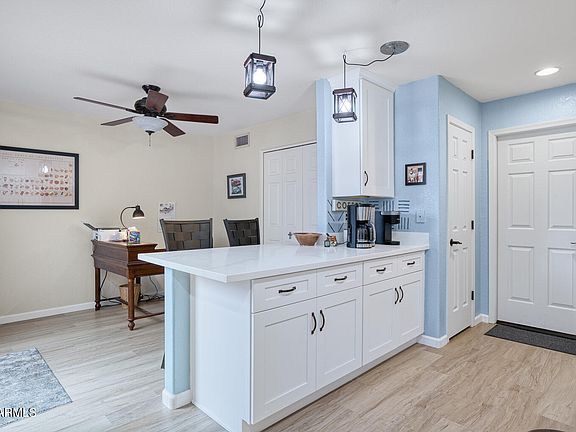 Rare 3-bedroom, 2-bath home nestled in the desirable Mirage Crossing community of Fountain Hills! Situated on a quiet cul-de-sac, this charming residence features a newly updated kitchen and bathrooms. The bright eat-in kitchen opens to the spacious great room, creating a comfortable and open floor plan perfect for entertaining or relaxing. The split primary bedroom offers privacy, while the screened-in patio overlooks a beautifully landscaped backyard filled with mature fruit trees—your own private oasis. Additional highlights include abundant storage with built-in garage cabinets. Conveniently located close to town, you'll enjoy easy access to great restaurants, shops, and all that Fountain Hills has to offer. NO HOA