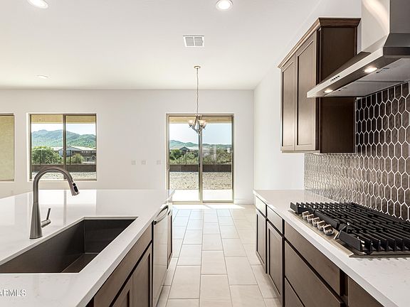 One of the most upgraded single-story homes in Lucero; modern, bright, and truly move-in ready. This Crimson plan features an open layout with clean tile floors, soft carpet in the bedrooms, and sleek brushed-nickel finishes. The kitchen shines with 42'' maple cabinets, whole-house quartz, a built-in gas cooktop, wall oven, canopy hood, large island, and stylish backsplash. Enjoy upgraded Cheyenne doors, recessed lighting, ceiling fan prewires, and a security system. The owner's bath offers porcelain surrounds and modern fixtures. A spacious, fresh home in beautiful Estrella.
