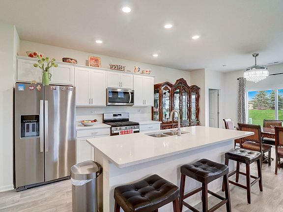 Discover this move-in-ready ranch townhome nestled within the serene community of Carillon at Cambridge Lakes in Pingree Grove. Welcome to the sought-after Chandler model, perfectly situated in a private setting that offers picturesque pond vistas. The Chandler epitomizes open-concept living, creating an ideal space for those who enjoy entertaining. The expansive kitchen, featuring an oversized island, seamlessly flows into the inviting living and dining areas The kitchen boasts stylish designer white cabinets adorned with crown molding, sleek quartz countertops, stainless steel appliances, a generously sized island with a convenient eating bar, and an ample pantry for all your culinary needs.The owner's suite provides a peaceful retreat, complete with a spacious private bathroom featuring a dual bowl vanity, a linen closet, and a generously proportioned walk-in closet. Carillon at Cambridge Lakes is a vibrant active adult community, offering a plethora of amenities, including a clubhouse, both indoor and outdoor pools, a relaxing jacuzzi, a state-of-the-art fitness center, scenic walking trails, and even a golf course for enthusiasts. Plus, worry not about lawn care and snow removal, as these responsibilities are expertly managed by the homeowners' association.