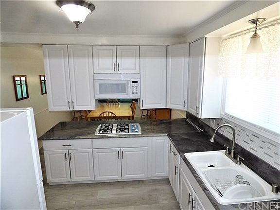 Granada Hills entertainer's Traditional pool home featuring beam ceiling living room with french doors and fireplace. Raised panel doors. Ceiling fans. Laminate flooring. Breakfast room. Remodeled kitchen and bathrooms. Wall sconces. Large covered brick patio with outdoor built-in barbecue. Three outbuildings - Bar/Pool room/kitchen, bedroom and bathroom. Central refrigerated air. Double attached garage with direct access. Gated front yard and drought landscaping.