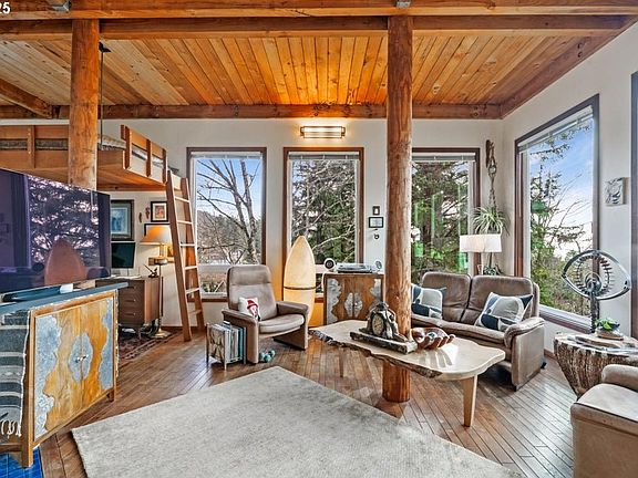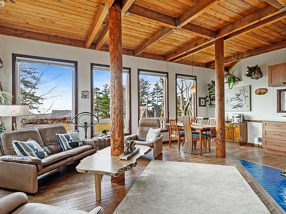 Stone-surround fireplaceGorgeous ocean viewsMassive beamsSpacious rooftop deckAngled windowsRich wood cabinetryWarm wood interiors