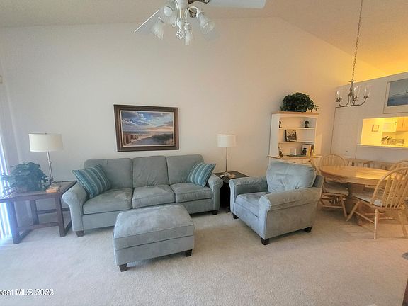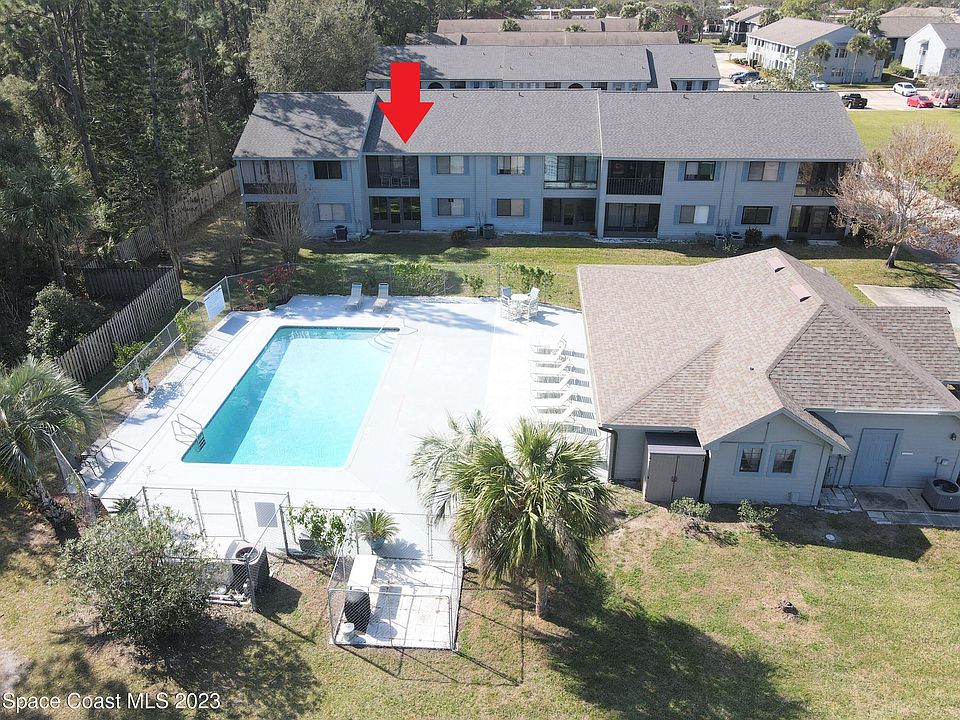 Tastefully decorated and furnished 2/2 condominium overlooking a beautiful heated pool and clubhouse. This second-floor unit is turn-key and ready for move-in. There are 2 large bedrooms, 2 full baths with a tiled shower in the primary bedroom, a separate foyer and laundry room with washer and dryer, nicely appointed kitchen with breakfast bar, and a living room-dining room combo leading out to an enclosed balcony looking over the pool and clubhouse. The unit has high ceilings and its own private parking space. Village Square of Titusville is a well-run condominium association in a convenient location, and this unit is in absolute perfect condition. All furnishings are available- just bring your toothbrush and enjoy the relaxing Florida lifestyle from your balcony!