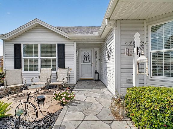 Impeccably manicured home set on a corner lot the The Villages. NO BOND. Curb appeal abounds with landscaping, a front patio, stamped-concrete drive and walkway, which makes a stunning first impression. Step into this lovingly cared for, updated, move-in ready, 3 bedroom, 2 bath home. You will find an open floor plan perfect for every day living and entertaining. Fresh interior paint palette creates a bright, cheerful vibe. Carpet free easy-care floors. The eat-in kitchen showcases luxurious quartz counters (4 months old) backsplash, pullout drawers, chair railing, stainless steel appliances and above cabinet lighting. The master suite is a true retreat with generous closet space and a private updated bath featuring quartz counters and designer finishes. Two additional bedrooms and updated bath provides comfortable guest or office options. Relax or entertain in the spacious screened lanai with epoxy floor. For extra convenience, a dedicated inside laundry room connects directly to the master bath from the master or the garage, perfect after a day of golf or time at the pool. Major upgrades give peace of mind: newer roof 2018, HVAC and water heater 2021. This home delivers low-maintenance living at its finest. Conveniently located between Spanish Springs Square and Lake Sumter Landing, you will be just minutes from shopping, dining, entertainment, golf courses, pools, and more. Don't miss this one. See for yourself.