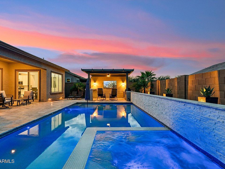 Like New Construction with impeccable Yard/Pool! This exceptional 5 Bed/3 Bath Lennar ''Evolution'' Home offers the perfect blend of luxury, comfort, and versatility. Featuring an open concept split floor plan, this layout is ideal for multi-generational living and entertaining guests, galore! The interior showcases a grand living/kitchen/dining combo that centers the home. Modern and inviting, the chef-inspired kitchen is complete with an eat-in quartz island and upgraded stainless steel appliances, with dining table adjacent. Spacious and sunny, the primary suite boasts an oversized walk-in closet, and spa-like ensuite bathroom with soaking tub, dual vanities, separate shower, and powder room. Off the living room you will find 3 bedrooms and 3 access points to the stunning backyard. Once outside, you get to bask in your own paradise! Contemporary and sleek, this waterfall-accented, heated in-ground pool and hot tub is a standout. With a pergola-covered outdoor TV entertainment center including built-in grill, plus a custom putting green, this home truly has it all inside and out! Attached yet entirely private, the fully equipped NextGen suite offers its own kitchen, laundry, separate entrance, and a private outdoor patio providing exceptional flexibility for guests, extended family, or potential rental income. Ideally located just off the Grand 303 exit, this home is within walking distance to the Asante Community Playground and Park, and just minutes from grocery stores, dining options, and the vibrant shops and entertainment along Bell Road and at Prasada.