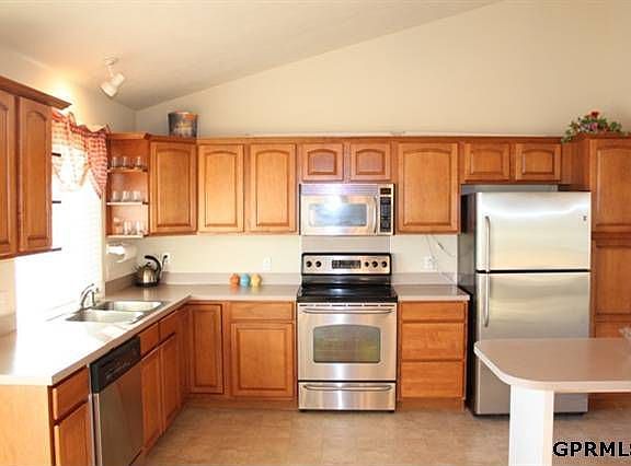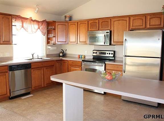Bright & beautiful home w/walkout basement! Cathedral ceilings in the living room, dining room, & kitchen. Eat-in kitchen has breakfast bar, stainless steel appliances, and pantry. Master suite w/walk-in closet & bath w/double sinks. Family room in finished walkout basement features corner fireplace. Oversized garage w/extra storage space. Elkhorn schools. Great location near park, creek, shopping, & restaurants.
