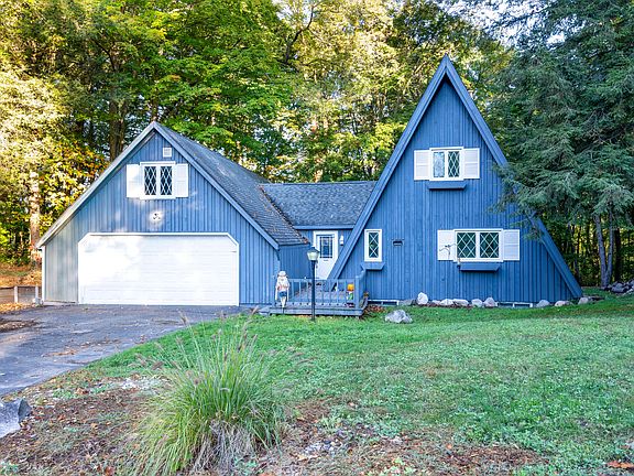 This charming A-frame home sits on nearly two acres of wooded privacy. Inside, a slate entry opens to a warm and inviting main floor featuring two bedrooms, one and a half baths, and a spacious kitchen and dining room. The living room's picture windows and striking stone fireplace create a cozy focal point, with an adjacent deck perfect for enjoying the peaceful setting. Upstairs, the loft provides an additional bedroom and full bath, offering flexibility and privacy. The lower level features a second stone fireplace, full kitchen, screened porch, two bedrooms (one non-conforming), and another full bath—currently being used as an in-law suite. Just a few of the many updates include new boiler system, water heater, water softener with reverse osmosis system. Seller Disclosures will have a complete list of updates. Discover the comfort, character, and tranquility of this one-of-a-kind retreat on Herrity Lane.