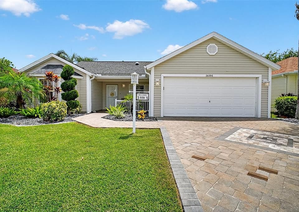 UPDATED FROM TOP TO BOTTOM – This beautifully maintained 3-Bedroom, 2-Bath Designer CYPRESS model situated on a quiet cul-de-sac street in the Village of POINCIANA. From the moment you arrive, you’ll notice the freshly refinished decorative paver driveway, elegant landscaping, glass storm door, and inviting front porch. Inside, the thoughtfully designed split floor plan is enhanced by new luxury vinyl plank flooring, crown molding, plantation shutters throughout and two solar tubes for added natural light. The spacious eat-in kitchen features extended cabinetry with a beverage cooler, granite countertops, tile backsplash, under-cabinet lighting, pull-out drawers, and stainless steel appliances including a gas range—perfect for the home chef. Additional interior highlights include updated modern light fixtures and fans, and an indoor laundry room with utility sink, folding station, and extra cabinetry. The primary suite offers two walk-in closets with custom built-ins, a dual-sink vanity with granite countertops, and a fully updated tiled walk-in shower with glass door. Both guest rooms also feature custom closet systems for optimal storage. For peace of mind, this home offers updated mechanicals including a NEW ROOF (2023), HVAC (2018), and a tankless water heater, plus a whole-house water filtration system. Additional upgrades include pull-down attic stairs and updated irrigation. Enjoy year-round comfort in the enclosed lanai under air with pull down shades that leads out to a private backyard patio framed by lush hedges. High-speed internet is on the way with Quantum Fiber Optics installation in progress. Located just around the corner from Seabreeze Recreation Center and conveniently positioned between Lake Sumter Landing and Brownwood Paddock Square, you’ll have easy access to executive and championship golf courses, dining, shopping, and nightly entertainment. This home offers the perfect blend of style, comfort, and location—your gateway to The Villages lifestyle. Schedule your private showing today!