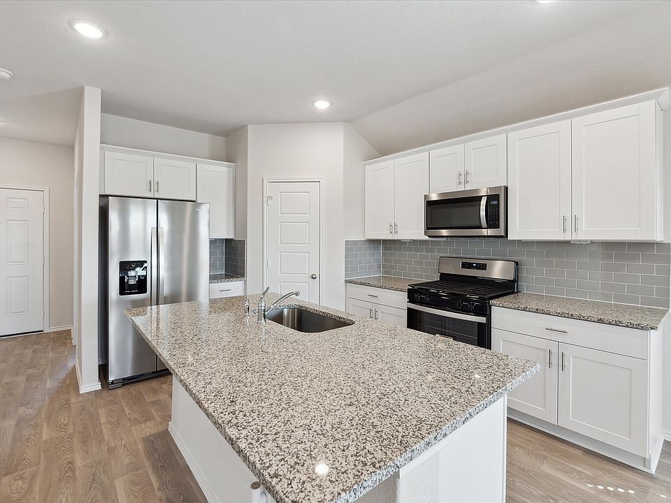 This stunning 1,800+ sq. ft., one-story, 4-bedroom, 2.5-bath residence blends modern comfort with open-concept living, perfect for families or professionals. The open floor plan seamlessly connects a spacious living room to a gourmet kitchen featuring granite countertops, a sleek backsplash, a gas stove, and a center island ideal for casual dining or entertaining. All appliances, including the washer, dryer, and refrigerator, are included for a hassle-free move-in. Vinyl flooring extends throughout the main areas, complemented by cozy, carpeted bedrooms that offer ample space and walk-in closets. The master suite boasts a double vanity, modern fixtures, and an oversized walk-in closet. Outside, a covered backyard patio slab is perfect for barbecues or relaxing, with a low-maintenance yard freeing up time to enjoy the nearby dining and shopping. Move-in ready with all amenities included, schedule a tour today!