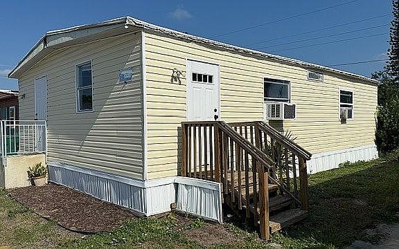 Stove and fridge are not included, but kitchen is prepared for a fridge water line, and only needs a fitting and a supply line for fridge water. The house has recently been repainted and had new flooring laid in the hallway and one bathroom. The new flooring is engineered wood planks, and the bedrooms have carpet. The rest of the house has laminate flooring with a few minor tears from usage. Both bedrooms have walk-in closets. The house had a 30-year TPO roof installed 4 years ago and has no leaks. All new siding and skirting was installed last year. There is a driveway that can fit two cars. Extra materials for repairs and touch-ups are included, including extra paint and several planks of flooring.