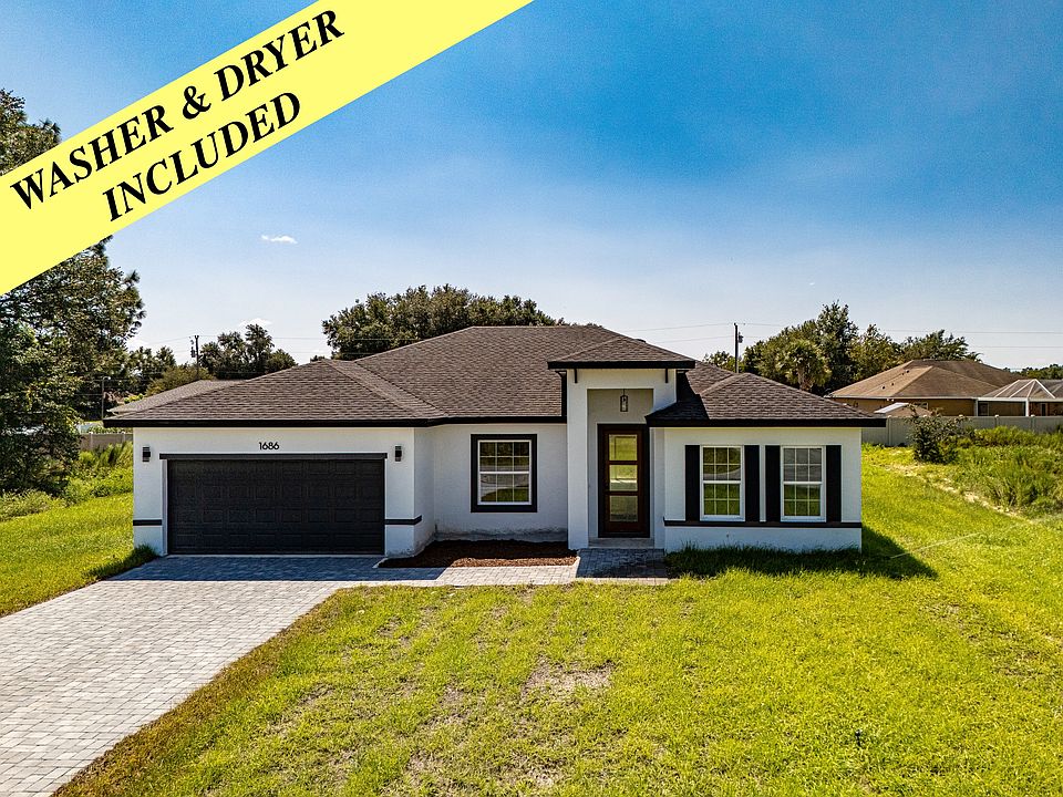 Welcome to your brand-new home in Ocala, FL. Available for your immediate move-in. Situated in a prime location, this home boasts a modern aesthetic and generous living spaces. With 4 comfortable bedrooms, 2 bathrooms and a spacious open floor plan, it's perfect for families gatherings or those who love to entertain. Kitchen is fully equipped with stainless-steel appliances, including a range, refrigerator, dishwasher, microwave, washer and dryer. Enjoy the convenience of an island and ample shaker cabinet space for all your culinary needs. Kitchen also features quartz countertops with waterfall edges, backsplash and island with feature wall, adding a touch of elegance to your everyday routines. Both bathrooms features quartz countertops, with double sink and glass shower on the main bathroom Entire living space and rooms have vinyl flooring tile for easy maintenance and a cohesive look throughout the home. Washer and dryer included. Don't miss out on this opportunity to experience luxurious living in a convenient location. Schedule your visit today! (Note: One or more photos have been virtually staged and are from a model home).