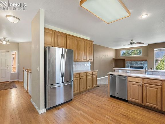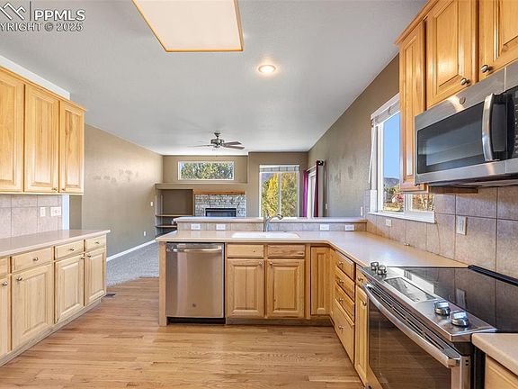 Experience maintenance-free, true main-level living in this beautifully maintained home offering stunning, unobstructed mountain views and an ideal Monument location. The welcoming main level features an open and bright layout, highlighted by hardwood floors and a spacious kitchen designed for both everyday living and entertaining. Enjoy stainless steel appliances, Corian countertops, hickory cabinets, a breakfast bar, pantry, and an eat-in dining area. The adjoining family room is warm and inviting with a gas fireplace and a walkout to the back deck—perfect for taking in peaceful Colorado sunsets and Front Range views. The main level also includes a generous primary suite with mountain views, a walk-in closet, and a private 4-piece bath featuring dual vanities. Convenience is key with a main-level laundry room and an attached 2-car garage. The home has been updated with new carpet throughout and a new roof, offering peace of mind for the next owner. The fully finished walkout basement adds valuable living space with a large family room, two spacious bedrooms, and a full bathroom—ideal for guests, multi-generational living, or a separate retreat. Step outside to the beautifully landscaped and fenced backyard, where you can relax, garden, or entertain in privacy. This low-maintenance community allows you to enjoy a lock-and-leave lifestyle with an HOA that covers insurance, exterior maintenance, lawn care, snow removal, and trash service. Located in the highly sought-after District 38 school system, you’ll appreciate being within walking distance to the Santa Fe Trail, neighborhood parks, and playgrounds, with quick access to I-25 for easy commuting to both Colorado Springs and Denver. Move-in ready, thoughtfully updated, and perfectly positioned to enjoy the best of Monument living—this home truly has it all.