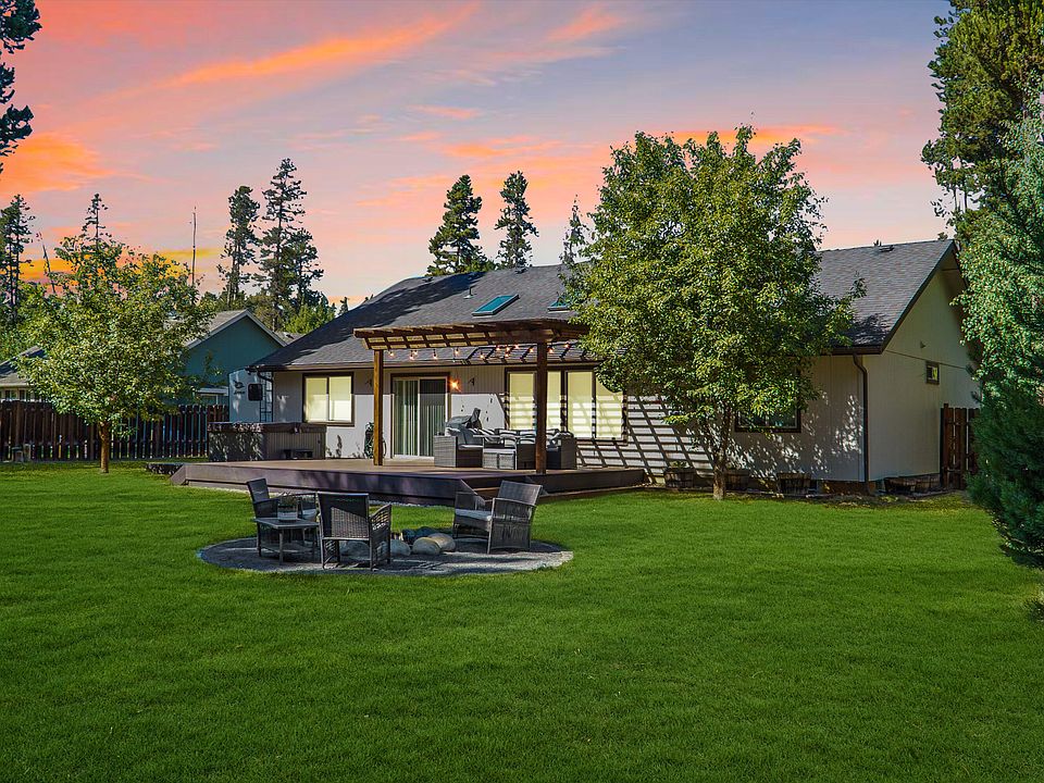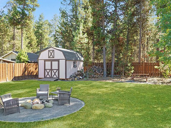 Discover serenity minutes from Sunriver, Mt. Bachelor, and the mesmerizing High Cascade Lakes. Set on a generous 1/2 acre of flat, fenced land, this home is an emblem of thoughtful landscaping with its gated entrance. Unveil a 3-bedroom, 2-bath sanctuary with an added office/den. Revel in the airy ambiance of the great room graced by vaulted ceilings, luminous skylights, and an updated floor-to-ceiling fireplace. A vast wall of windows reveals the landscaped backyard—, complemented by a new 700 SF Trex deck, perfect for leisure. As evening falls, gather around the inviting fire pit under the canopy of mature pine trees. The home's entrance is marked by a 200 SF cedar pergola deck, framed by elegant rock beds. Additional highlights include a 196 SF storage shed with loft, modern appliances, updated laminate floors & carpet, and abundant parking for boats and RVs. This peaceful haven beautifully fuses indoor comfort with outdoor charm.