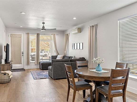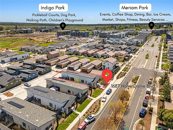 Built in 2023, this stylish single-story modern home offers 3 bedrooms, 2 bathrooms and 1,306sf of thoughtfully designed space. Enjoy abundant natural light thanks to its west-facing orientation and open-concept layout connecting the kitchen, dining, and living areas. The kitchen features a full GE appliance package, including the washer/dryer, and fridge - plus generous cabinet space. Upgrades include cordless blinds, luxury vinyl plank flooring throughout, and energy-efficient ductless mini-splits and owned solar. The primary suite includes dual-sink vanity and walk-in shower, while two guest bedrooms share a hall bath. Outside is a covered front porch and back patio with a fenced side yard and low-maintenance landscaping. A two-car garage, private parking pad and street parking offer plenty of space. Located in the vibrant Meriam Park community - just steps from shops, dining, a dog park, pickleball courts, live music, offices, and more - all with no HOA fees!
