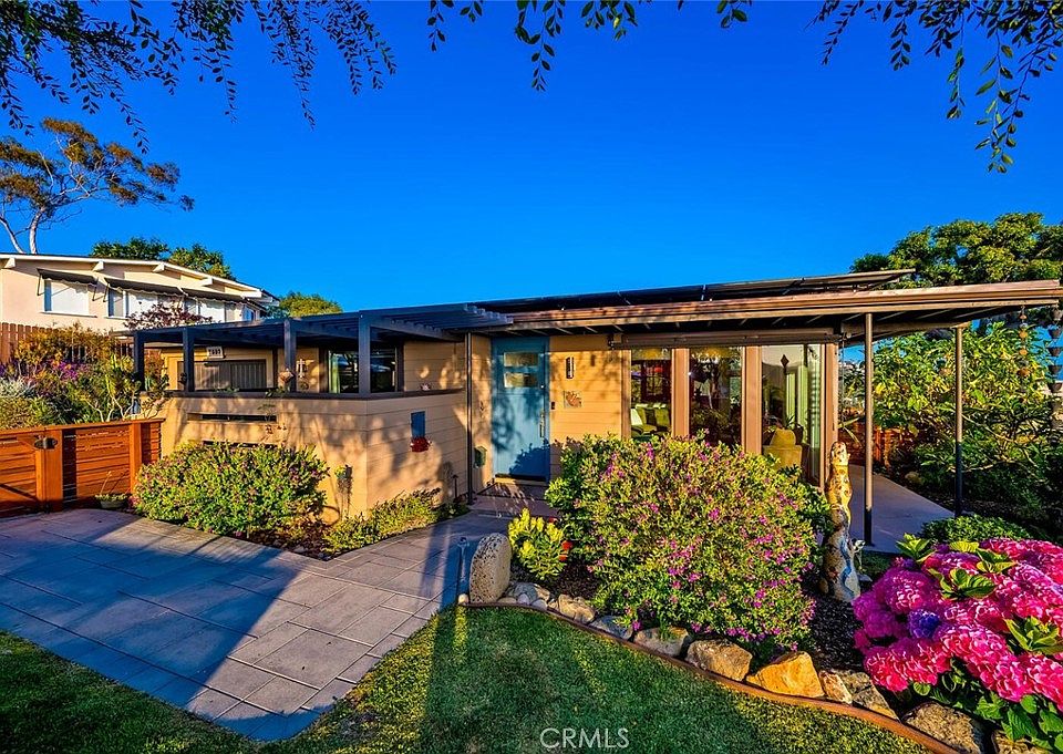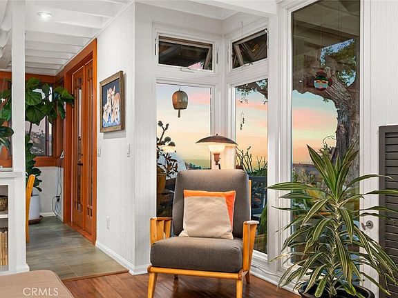 Perched above the pristine coves of laguna beach, this mid century modern masterpiece echoes the timeless influence of early Frank Loyd Wright design. With iconic post-and-beam construction and dramatic walls of glass, the home is thoughtfully positioned to capture sweeping ocean and canyon vistas from every angle. This single level, two bedroom two bath retreat has been beautifully remodeled to blend classic architecture with modern comforts. New floor to ceiling windows and elevated skylights flood the space with natural light, while lush landscaping and panoramic views create a seamless indoor outdoor living experience. Set on nearly 10,000 square feet of flat, useable land, the home offers privacy, serenity, and room to grow-complete with architectural plans included in the sale and potential for an ADU. Inside, a chef's ocean view kitchen flows effortlessly into the open plan living and dining rooms, grounded by rich wood flooring, and elegant stone surfaces throughout. Step outside onto the expansive wrap around deck, where a gentle breeze and post card worthy sunsets await. Cozy up by the wood burning fireplace as day turns into night and the coastline begins to glow. Whether you're seeking a peaceful retreat, an entertainer's dream, or a foundation for future expansion, this one of a kind architectural jewel delivers it all.