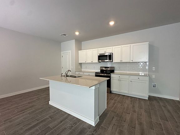 The Richmond floor plan features stylish wood-look tile flooring, creating a warm and inviting atmosphere. The kitchen boasts White cabinets, stainless steel appliances, pantry, dining area and a tiled backsplash. Home features second living room/loft area upstairs with 1 bedroom and 1 full bathroom. The primary suite is complete with a walk-in closet, a double sink vanity and a tiled shower stall. Two additional bedrooms downstairs feature carpet and ceiling fans. Enjoy relaxing evenings on the back patio overlooking the wooded lot. Other features include covered front porch, sprinkler system, interior laundry room, fenced in backyard and 2-car garage. The community includes walking trails, basketball court, pavilions and fire pits. Coming Soon- Clubhouse, soccer field and community pool. Lawn Care Included- sodded front, side yards and within the fenced backyard. Pets are case by case.