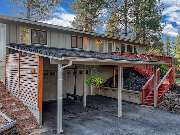 This single-level, 1,417 sq ft home features Acacia engineered hardwood and tile flooring, with large living room windows offering views of mature Ponderosa pines. The kitchen includes custom shelving and appliances less than 4 years old. Step outside to a large deck overlooking a peaceful, fenced backyard with a solar-powered chicken coop, greenhouse foundation, garden beds, and a custom fire pit. Outbuildings include a wood shed, garden shed, and equipment shed.
