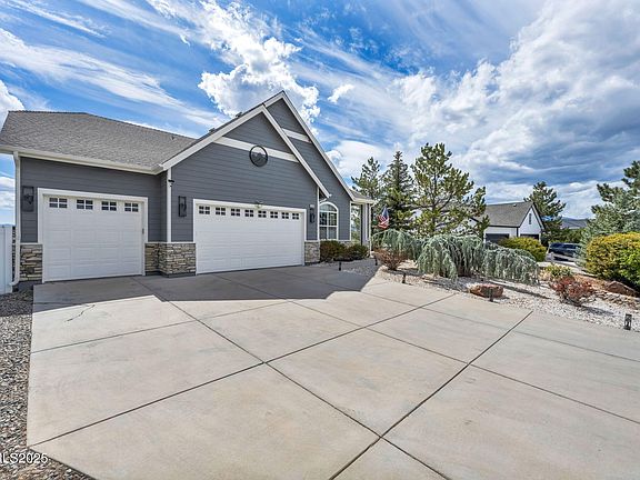 Set on just over an acre in the desirable Skyline Ranch community, this beautifully updated 4-bed, 4-bath home offers luxury, comfort, and functionality with breathtaking views of the Pine Nut Mountains and Sierra Nevada. Inside, enjoy quality craftsmanship with real maple and walnut hardwood flooring, an updated kitchen with newer appliances. The spacious layout includes a main-level master suite with an electric fireplace, and spa-like bath. Additional features include zoned climate control with dual WiFi-enabled thermostats, built-in stereo system, and upgraded lighting throughout. Downstairs is another living area with 2 bedrooms, full bathroom and a full wet bar. Exterior highlights include a new craftsman-style insulated front door, motion-sensing security lights, recent professional paint, ultra-quiet garage opener and RV parking with power hookup. Outdoor living is made easy with an upper level deck, lower level covered patio, hot tub, and two powered workshops. Located near BLM land for easy outdoor access in a quiet, low-traffic neighborhood, this home combines modern amenities with the natural beauty of Northern Nevada, truly a Skyline Ranch gem.