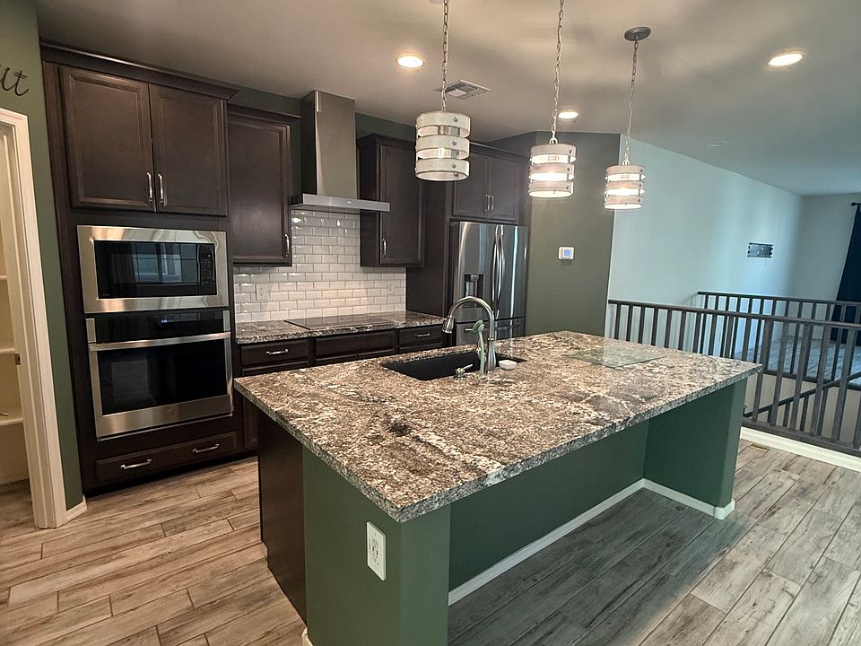 Chef's kitchen with quartz countertops, upgraded cabinetry, stainless steel appliances, and large island