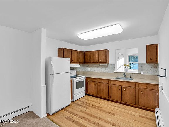 This charming Newport model is ready for you to move right in and enjoy! Custom stone and brick work on the front gives this home a luxury look. The enclosed front porch is a bright and inviting space, perfect for relaxing, with the bonus of a large storage/coat closet. The open living and dining area offers ample room to design your ideal layout, featuring brand-new carpeting (with hardwood underneath) and freshly painted walls. Window have been updated to vinyl, the bathroom was updated, the boiler for hot water baseboard heat is only 9 years old, brand new hot water heater in 2024 and this home also has a new roof. The only thing this home needs is your personal touch on the kitchen. Great location off the main roads with close proximity to shopping and the Jersey Shore Beaches!