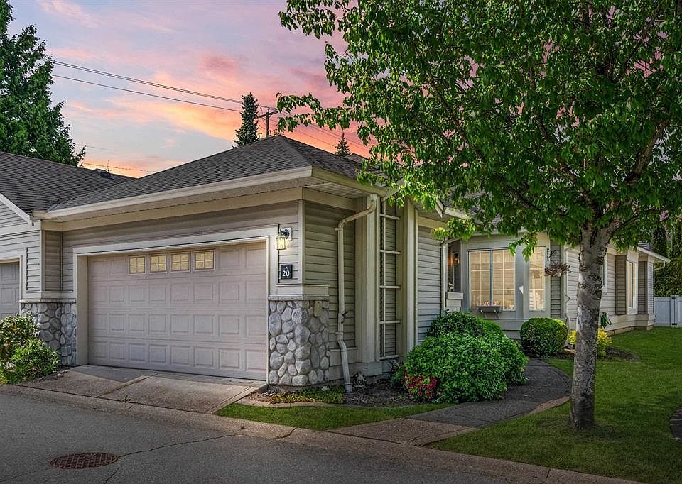 Welcome to Stonecroft by Polygon, a rarely available 55+ gated community! This bright and clean rancher-style end-unit townhome offers one-level living with 2 spacious bedrooms, 2 full baths, and a double garage. Enjoy the feel of a detached home with vaulted ceilings, an open-concept layout, and a sunny kitchen, and private backyard. Perfect for those looking to downsize without compromise. Conveniently located near shopping, transit, parks, golf, recreation, and the future SkyTrain. Don't miss this opportunity! Check upcoming open house details, this home won't last - Quick possession possible.
