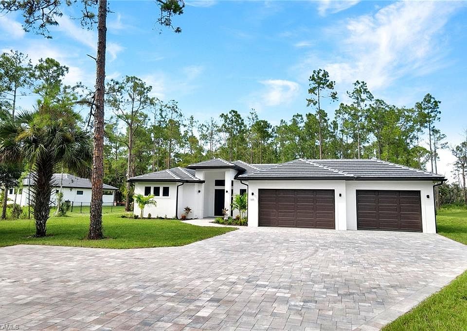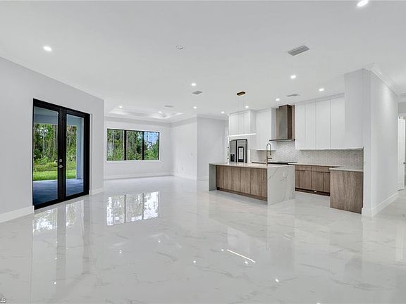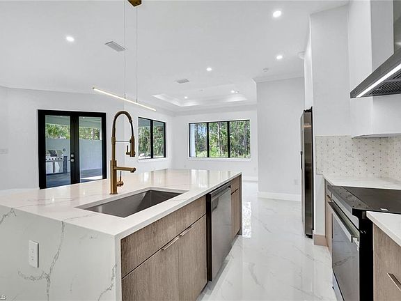 This property is 100% uplands and sits in an exceptionally prime location just off Wilson Boulevard. Surrounded by other beautiful homes, it offers the perfect setting to build your dream residence in one of the most desirable areas of Golden Gate Estates. Inside, the home showcases a stunning modern kitchen with sleek white upper cabinets and warm wood-tone lowers, creating a sophisticated two-tone design. Expansive quartz countertops with waterfall edges and a full-height designer backsplash add a touch of luxury, while the oversized island with a contemporary gold pull-down faucet blends style and function. High-end stainless steel appliances, recessed lighting, and a minimalist pendant fixture complete this bright, open space—perfect for everyday living and entertaining. The master bathroom is equally impressive, featuring floor-to-ceiling tile, a luxurious free-standing tub, and dual showers, creating a spa-like retreat within your own home. The home also boasts a huge outdoor lanai with a fully equipped outdoor kitchen, ideal for gatherings and enjoying the Florida lifestyle year-round. A thoughtfully designed residence that balances modern elegance with timeless comfort in an exceptional location.