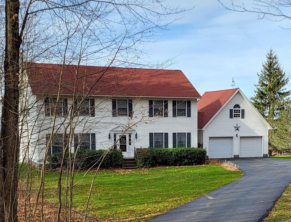 This charming Colonial is located with outstanding panoramic views of valleys and mountains. The home has 4 Bedrooms, 2.5 Baths, Eat in kitchen, formal dining room, liv room, family room w/fp. Glass doors lead to a deck and partially fenced back yard. There are 2 smaller porches & attached 2 car garage w/ 2nd floor storage. The lot is wooded between the road and home giving you that seclusion. Behind is an open vista to a large field that abound with wildlife. In addition there is a barn, shed and nice landscaping.