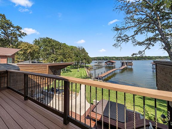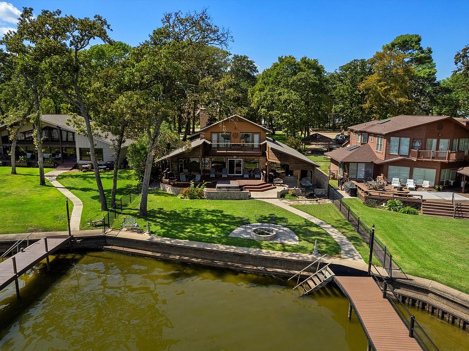 Recently reduced for Lakefront luxury with room for everyone in Deer Island Estates, Cedar Creek Lake! This incredible home truly has it all, whether you're seeking a peaceful lakeside retreat, the ultimate entertaining space, or a full-time waterfront lifestyle. Nestled in one of Cedar Creek Lake’s most sought after neighborhoods, Deer Island Estates, this spacious property offers stunning deep open water views and wonderful entertaining space. Enjoy quiet mornings or vibrant evenings from your patio or hot tub. The custom boathouse is built for both fun and function, featuring four PWC lifts with automatic power covers, plus a low maintenance aluminum upper deck perfect for sunbathing. The home boasts five generous bedrooms and four full bathrooms, with granite countertops throughout. Downstairs: primary suite offers breathtaking sunrises with eastern-facing water views, two large guest bedrooms that can be converted to fun bunk, games, or flex rooms, and a full guest bathroom. Upstairs: two guest bedrooms and a full bath provide additional privacy for guests or family. Step outside to a spacious covered back porch that extends your living area, complete with hot tub and lakeside fire pit. Additional features include a fireplace, fully fenced backyard, ambient outdoor lighting, and an oversized two-car garage. Whether you're entertaining, relaxing, or making memories, this home is your gateway to lakefront living at its finest.