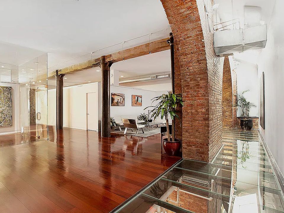 Exposed brick archesGlass floorsRugged wood beamsBlackened steel columns