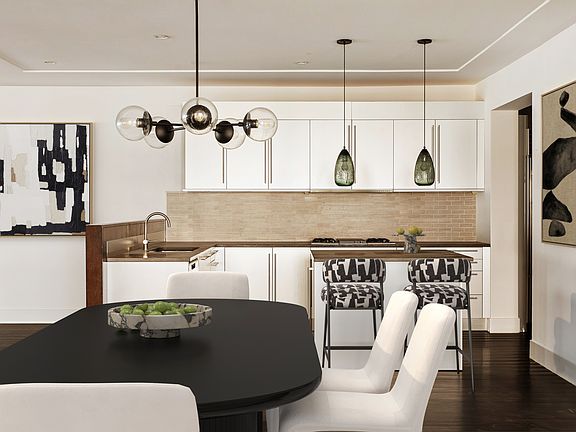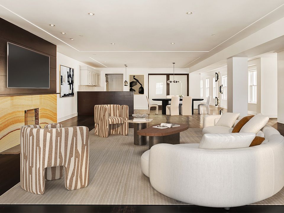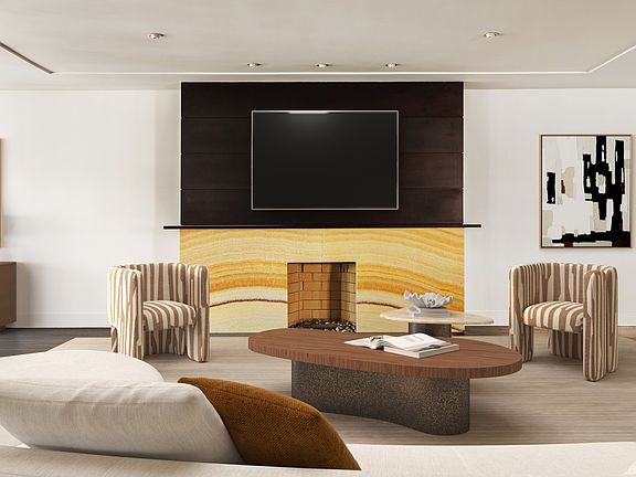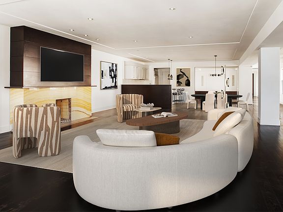 Enter directly from a private keyed elevator into a sweeping great room, where wide-plank hardwood floors and custom wall panels frame a striking wood-burning fireplace. The open Bulthaup kitchen blends form and function with slate countertops, sleek cabinetry, and a stylish breakfast barperfect for both entertaining and everyday living.