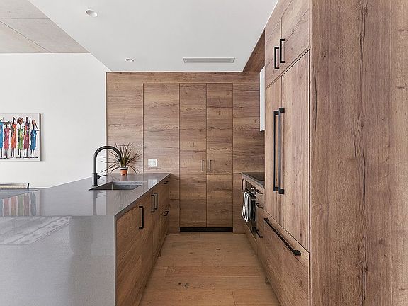 The kitchen exudes modern sophistication with custom millwork, Fisher Paykel appliances seamlessly integrated with matching panels, and quartz countertops. Porcelanosa tile work and fixtures adorn the bathrooms, featuring a wooden floating vanity, hidden ballast toilet, rain shower, and matte black fixtures.