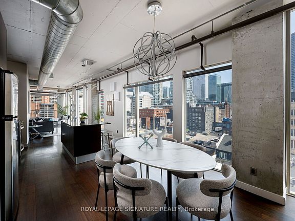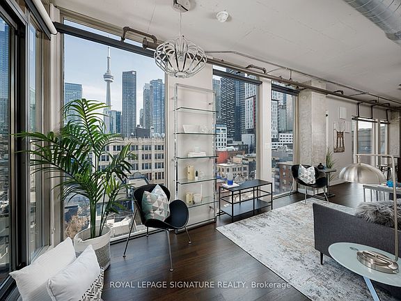 Elevate your everyday in this jaw-dropping 2-bedroom, 2-bathroom designer loft at One Six Nine Lofts where luxury meets art in the heart of downtown Toronto. With 1,047 square feet of impeccably curated space, this rare offering delivers the ultimate in modern urban living. Massive full-length windows frame stunning, unobstructed views of the CN Tower and city skyline, flooding the home with natural light. Step inside and be captivated by industrial-chic elements: exposed concrete ceilings, rich hardwood floors, and sleek imported Italian cabinetry. Brand-new tiles, modern cabinetry, upgraded fixtures, and upscale designer lighting elevate the space with a fresh, modern edge. The open-concept layout, soaring 10-foot ceilings, and chef-inspired kitchen make entertaining effortless and unforgettable. Plus, a fully refurbished HVAC system (completed in 2023) ensures year-round comfort and efficiency. The expansive primary suite offers a true urban retreat, complete with a spa-like ensuite, custom-designed closets, and a stunning mural by internationally acclaimed artist Alex Turco. The spacious 2nd bedroom easily fits a king size bed, while the large balcony provides practical outdoor space. All these features creates a bold, sophisticated backdrop that makes this loft truly one-of-a-kind. Innovation meets convenience with a cutting-edge parking stacker system exclusive to residents. Set within a boutique building of just 45 unique suites, this address places you steps from Toronto's cultural pulse TIFF Bell Lightbox, premier dining, boutique shopping, and vibrant nightlife are all at your doorstep.This is more than a loft its a statement. Secure your place among Toronto's finest.