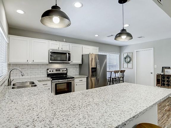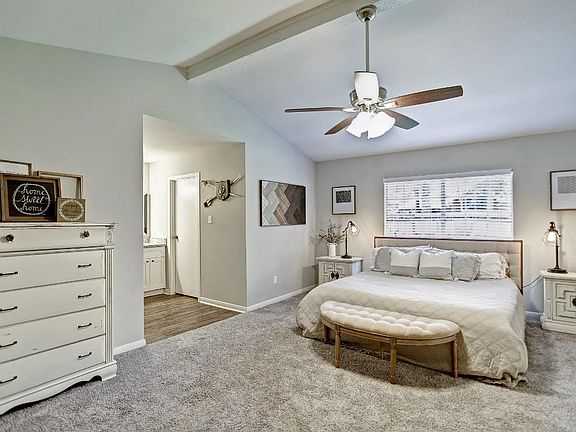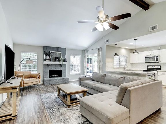 LOCATION, LOCATION, LOCATION! This charming one-story home is situated on an oversized lot in sought-after Grogans Mill minutes from fine shopping, dining and major throughfares. Large cozy living room has a brick floor to ceiling gas-log fireplace, wood beam and natural light galore! Wide open floor plan with seamless movement from the dining room for a beautiful accent wall and the living room and kitchen. The gorgeous kitchen offers granite countertops, breakfast bar and stainless-steel appliances. Oversized primary bedroom has enough room for a sitting area, nice size closet and dual sinks and barn door into the walk-in shower. Two sizable secondary bedrooms down the hall are a full bathroom. Amazing backyard with a covered patio with cable connections, ceiling fan, firepit area, and extended concert slab that is great for relaxing and entertaining guest! Nearby walking trails and golf course. This one wont last long!