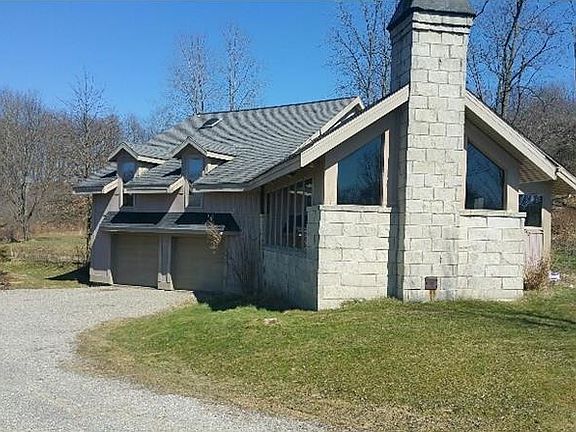 Serene and peaceful country setting on 10 acres! Unique custom built home offers breathtaking stone fireplace, spacious kitchen with stainless appliances and lots of cabinets and counter space. Upper level has two large bedrooms, full contemporary bath and large master suite. This suite offers two decks - one overlooking the pond and a second one with private hot tub. There is a large walk in closet with many built ins and also a half bath. Spiral staircase leads to loft area that could be den or office. Full basement with workshop and two car garage.