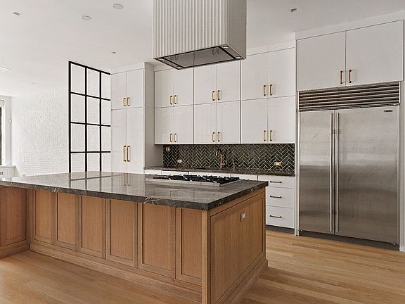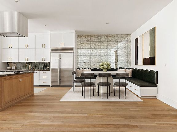 At the heart of the home, the chef’s kitchen is a masterpiece of design. Sleek white lacquer cabinetry with brass accents, honed marble countertops, and a striking green Moroccan tile backsplash create a striking visual contrast. State-of-the-art Wolf, Sub-Zero, and Bosch appliances ensure a seamless cooking experience, while a generous eat-in island flows into a custom leather banquette that elegantly wraps the corner, offering an inviting dining space for up to 10 guests. Thoughtfully placed steel-and-glass partitions provide definition while preserving the home’s open, airy flow.