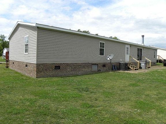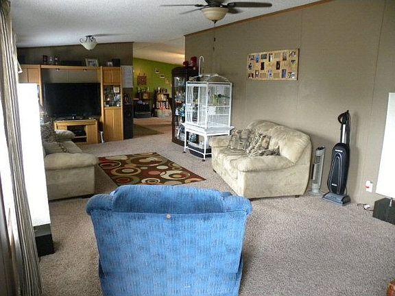 Large,EXCEPTIONALLY NICE 4 bedroom,3 bath doublewide with some sheetrock walls & open floor plan. NEW: carpet and paint,roof in 2011,light fixtures & ceiling fans,microwave,front deck,automatic foundation vents,blinds and curtains,Larson energy efficient front door and screen door,chimney cap,landscaping,security system,2 sets of back steps and shutters.Master bedroom is on opposite end from the other 3 bedrooms.CITY SCHOOLS/SCHOOL TAX,BUT NO CITY TAXES SAVING YOU MONEY!Also,fireplace in the dining room,kitchen pantry, HUGE master bedroom closet and bath.Refrigerator in laundry room conveys, but not the one in the kitchen.Only barn shaped storage conveys.