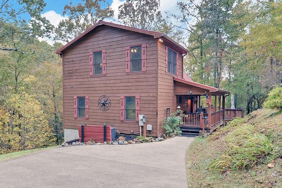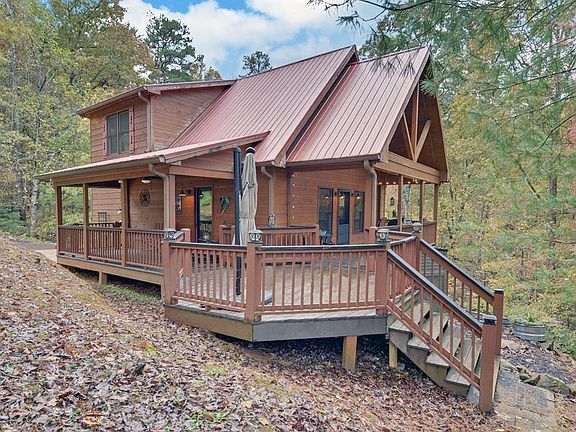 Escape to the tranquility of the North Georgia Mountains in this spacious 4-bedroom, 3-bathroom cabin ideally situated on over 1.8 private acres. Combining rustic charm with unbeatable convenience, this home offers the ideal blend of a mountain retreat and easy access to local life. With 4 bedrooms and 3 full baths, there is ample room for family, guests, or lucrative short-term rental opportunities. Step inside the open-concept floor plan featuring a soaring ceiling, warm wood interiors, and a magnificent stone, floor-to-ceiling fireplace that serves as the centerpiece of the living area. Embrace mountain breezes from the wrap-around porch—perfect for entertaining, dining al fresco, or simply relaxing with a book. The terrace level offers a fantastic second living area, featuring a large den and a convenient walk-out basement, perfect for a media room, game space, or overflow guest quarters. You get the best of both worlds! This cabin is just minutes away from the excitement and charm of Historic Ellijay—quick access to shops, restaurants, and breweries. Ellijay is known for its unique boutiques, antique stores, and seasonal festivals, as well as its proximity to the area's popular hiking trails, mountain biking, and the famed apple orchards.