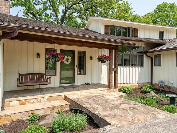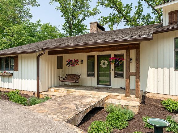 Outstanding, remodeled custom-built 2-story on 4.76 acres in an area of unique homes on small acreage. Just outside city limits with city sewer and private well. Wooded and serene setting! 2 car attached and 2 car detached garages. Amazing vaulted great room and dining room with beamed ceilings, recently painted walls, soaring brick fireplace, new light fixtures and new Hickory wood floors. Updated kitchen with newly painted cabinets, granite countertops, new oven/microwave/dishwasher and new light fixtures. Enjoy the screen porch and pergola sitting area on the expansive deck. Main level primary bedroom suite with walk-thru to full bath that includes an air bath tub, walk-in tiled shower, stylish painted cabinets and a circular staircase to lower level room (extra storage or workout room!). 2nd bedroom and updated bath down the hall. 2 more bedrooms, 3/4 bath and walkout to rooftop patio upstairs. Fun lower level family room with wet bar, wine cellar, workshop and storage.