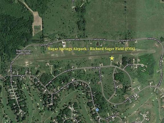 Close to 1/2 acre off Sugar Springs Richard Sager Field (5M6) all cleared, extra fill driveway, electric hook-up. Lot will need sewer and well. Great location for camping or to be able to taxi to your hanger home. Enjoy yearly Fly-ins. Active group of pilots located in the area and many amenities that included with ownership, such as, access to the 18 hole championship golf course, pro shop, restaurant & pub, indoor heated pool, exercise center, tennis courts, bocce ball courts, chalet & sledding hill, walking (nature) trails, activity building, access to 2 all sports lakes, Lake Lancer/Lake Lancelot, and 15 beach clubs for quality family fun.