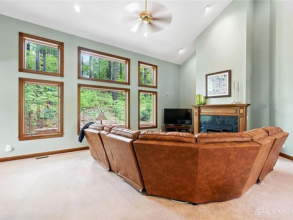 Custom-built brick home nestled on 3.7 wooded acres in the Bellbrook-Sugarcreek School District, showcasing high-quality craftsmanship with solid wood doors, elegant molding, a spacious first-floor primary suite, and a fully finished walkout basement with its own bedroom and full bath. The moment you step inside, you’ll be captivated by the soaring ceilings, red oak hardwood floors, and a breathtaking wall of windows in the two-story great room that invites the outdoors in. The home is flooded with natural light, creating a warm, inviting atmosphere throughout. The chef’s kitchen is a true centerpiece—featuring rich cherry cabinetry, granite countertops, stainless steel appliances, an expansive island, and an adjoining breakfast room that opens to one of three spacious decks, perfect for entertaining or relaxing under the trees. One of the homeowner’s favorite things? Stepping outside to savor the pine-scented breezes that drift through the property, bringing with them a peaceful, almost storybook quality to daily life. A hidden gem of the home is the 20x19 sunroom—a peaceful, window-wrapped retreat offering tranquil views of the surrounding forest. The main-level primary suite provides a luxurious private escape, complete with a spa-like bathroom, oversized walk-in closet, and direct access to a cozy den with a brick wood-burning fireplace. Upstairs, you’ll find two additional bedrooms with a shared full jack-n-jill bath. The lower level has its own private entrance and full kitchen, making the house ideal for multigenerational living. Heated driveway for effortless winter access, 32x27 oversized 2-car garage with plenty of storage and overhead storage. Recent updates: roof (2020), furnace, water systems, and appliances. Located in River Ridge Estates—private, peaceful, and still close to shopping, dining, and commuter routes.