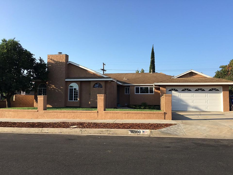 The perfect house for family or entertaining, with expansive sunlit open floor plan. Large sunken living room with fireplace and cozy private patio; large formal dining room; spacious family room with sliding doors to large backyard and open to kitchen with separate laundry room. Three bedrooms and two bathrooms. Lush new yard and landscaping. Over 2,000 square feet. Updated kitchen includes granite counters, new cabinets, stainless steel appliances, recessed lighting, new fixtures. Bathrooms updated with granite vanities, new tile flooring, shower surrounds. New interior/exterior paint, lighting fixtures and engineered wood flooring throughout. New systems, including central heating, A/C and duct work. New energy-efficient doors and windows throughout, 200-amp electrical box, completely new copper re-pipe. Finished garage with windows and new garage door and opener. Buyers won't find a better price in a better location: within one mile of Trader Joe's, Starbucks, Vons, Granada Hills Park and easy access to the 118 Freeway. Ready to move right in.