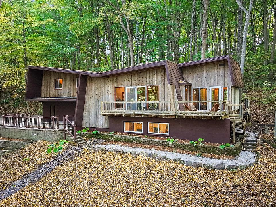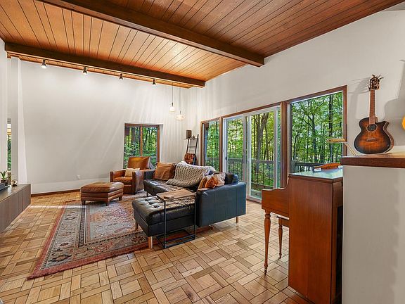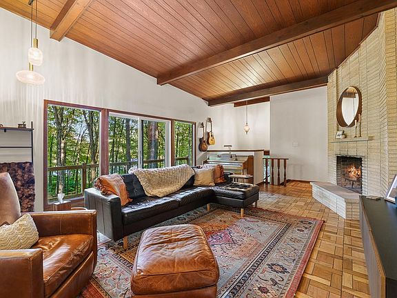 Perched on a wooded 2-acre lot with Sheboygan River views, this rare mid-century modern retreat blends timeless design with today's comforts. Striking butterfly roofline, exposed beams, & restored parquet floors that celebrate the home's architectural heritage. The dramatic floor-to-ceiling, two-way fireplace connects the living & dining spaces, creating warmth and style throughout. A three-seasons room & wrap-around porch invite you to enjoy the serene surroundings, while private trails wind through your own nature preserve. The lower level promotes wellness with an exercise room, custom cedar sauna, & negotiable cold plunge tub. Conventional heating is complemented by a wood-burning furnace for energy efficiency. Updates include a new roof, fascia, & soffit ('24) & new septic in ('22).