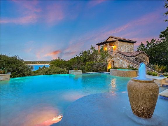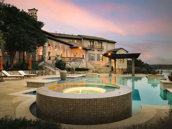 Welcome to La Dolce Vita: An exquisite waterfront estate at the Hollows on North Shore. This home boasts panoramic views of Lake Travis & combines the timeless beauty of Tuscan architecture w/modern comforts, in an unparalleled living experience.on over 2.5 acres. Enjoy the 400+/- ft of accessible lake frontage & drivable cart path leading to a rare, private deep water boat dock w/2 stalls, Jet Ski lifts. A private cobblestone driveway leads you to the grand entrance. The exterior exudes endless beauty w/classic stonework, terracotta roof tiles, & wrought iron accents evoking the essence of an Italian villa. The main living area has cathedral ceilings, a majestic stone wall &fireplace, windows that frame the stunning lake views, rich wood accent beams, & wrought iron chandeliers to showcase every bit of detail this home offers. The ornate dining room off of the foyer is ideal for hosting grand celebrations or intimate gatherings with friends. The gourmet kitchen, equipped with state-of-the-art appliances, custom cabinetry, and a spacious island with breakfast bar is every culinary enthusiasts dream.