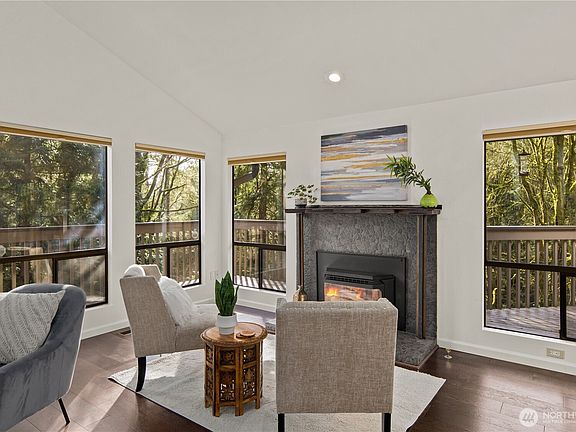 Nestled in the tranquil Hideaway Community, this spacious, 2-bed, 3-bath contemporary with potential 3-bed flex space and full bath on main level offers a private retreat surrounded by nature. Enjoy the peaceful ambiance of a protected greenbelt with a babbling creek in your backyard. Bright and inviting, the home features vaulted ceilings, floor-to-ceiling windows, new skylights, bathrooms, paint and carpet. Enjoy multiple decks, hardwood floors & quartz finishes. Spacious two-car garage and ample storage. HOA dues include gated boat/RV parking, earthquake insurance, and roof cleaning. Newer roof and special assessment for exterior painting fully paid off. Close to Microsoft, Downtown Bellevue. PRE-INSPECTED! Move in ready!