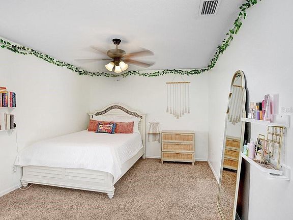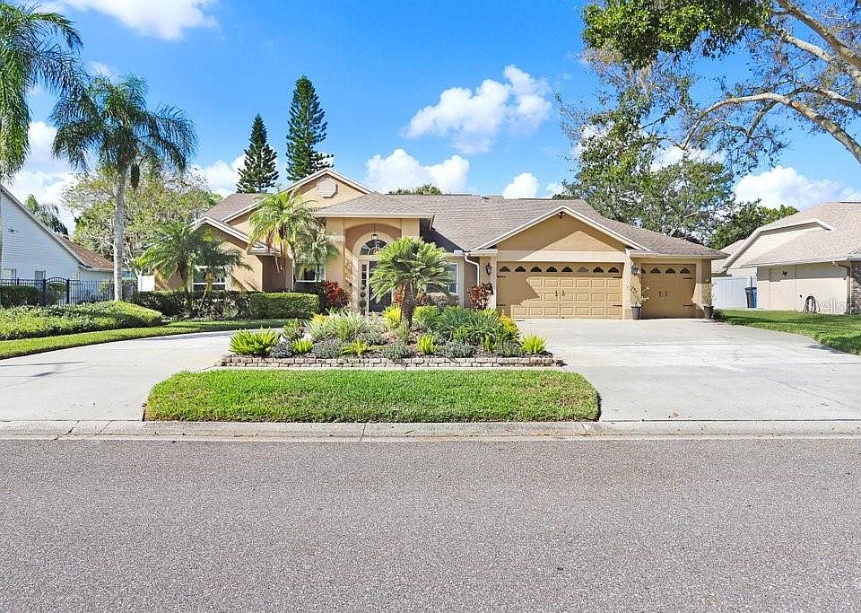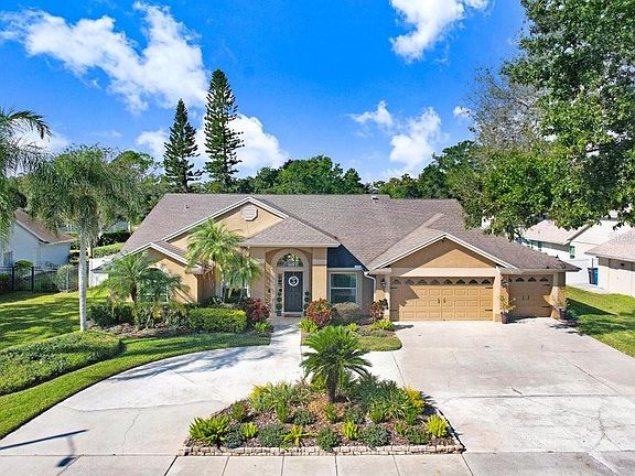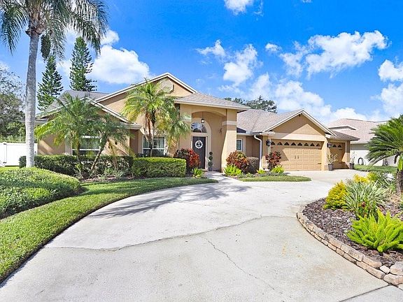 Rare, beautifully appointed home in the sought-after Trails at VanDyke Farms community, this 4-bedroom, 3-bathroom pool home offers the luxury and convenience you desire. Sitting on a 16,000 sq ft lot, arrive via a circular driveway that leads to a 3-car garage. Upon entering, you'll immediately see the endless entertaining possibilities. The home features an open floor plan that allows you to customize your own at-home office, formal dining room, formal living room, or all three! Well-designed with a split floor plan, this home's primary bedroom is a true retreat, offering privacy and comfort, with high ceilings and wide sliding glass doors that provide private access to the heated, screened-in saltwater pool. The luxurious primary bath is a dream, featuring a spacious walk-in closet, granite countertops, dual vanities, a walk-in shower, and a soaking tub to meet all your needs. The interior features an open floor plan, high ceilings, and abundant natural light. Double sliding glass doors with pool views from all rooms. Travertine, tile, and hardwood flooring seamlessly connect each space. As you enter the foyer, you'll be welcomed into elegant dining and living areas overlooking the pool. Relax at day's end with a drink from the built-in bar and unwind by the wood-burning fireplace with a newly rebuilt chimney. The updated kitchen, equipped with modern stainless-steel appliances, provides ample counter space, an island with seating, a pantry, and a finished laundry room with custom cabinets. The thoughtfully designed split floor plan ensures privacy and peaceful separation of bedrooms. The secondary bedrooms are nearby and share a bathroom with dual sinks. The final bedroom has its own space in the home, including a bathroom, making it ideal for guests. The backyard is a Floridian's dream, featuring a screened lanai, heated saltwater pool, and new vinyl fencing, offering endless possibilities to create your perfect paradise. Plenty of room to add an outdoor kitchen or tiki bar! Situated on a large lot, there's ample space for outdoor enjoyment and future landscaping, easily maintained with the digital irrigation system. Pool Heater ($4000 value), HVAC System (2021), Pool pump system (2024). Community life at Van Dyke Farms is vibrant and full of opportunities. Residents enjoy abundant green space and high-quality amenities, including multiple sports courts for tennis, pickleball, and basketball, an exercise trail, a clubhouse, and a playground. Nature lovers will appreciate the conservation areas and shimmering lakes with a fishing dock and gazebos, perfect for relaxed walks and outdoor fun. Van Dyke Farms is in one of Tampa Bay's top A-rated school districts (Hammond, Martinez, and Steinbrenner), with quick access to Veterans Hwy & Suncoast Parkway, as well as close proximity to the airport, shopping centers, and entertainment venues. This home offers easy commutes, blending tranquility with connectivity. Don’t miss your chance to experience Florida living at its best. Schedule a viewing to see your new home today!
